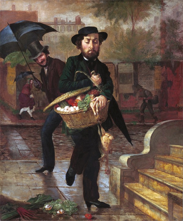 Моделью для этой веселой иллюстрации к супружеской жизни Спенсер послужил ее собственный муж. Картина изображает молодого человека, которого жена послала за продуктами, и который ощущает укол унижения на публике, когда содержимое его корзины высыпается на землю. Такая смена ролей, хоть и преподносится в романтическом свете начала семейной жизни, все же необычна и предлагает альтернативу общепринятой нуклеарной семье, которая традиционно изображалась в большей части искусства середины девятнадцатого века.