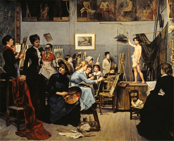 Основанная в 1868 году, Академия Жюлиана принимала женщин, которые обучались отдельно от мужчин и без рисования с живой натуры. Мария Башкирцева начала учебу в 1877 году и упивалась самостоятельностью художественно-студенческой жизни, написав следующее: «чувствуешь себя такой счастливой, такой свободной, такой гордой». Она организовала для себя уроки анатомии, а позже успешно лоббировала для женщин право обучаться, рисуя с живой натуры. Ее оживленная сцена, изображающая такой класс, тем не менее, включает юношу-натурщика, частично задрапированного, а не полностью обнаженного.