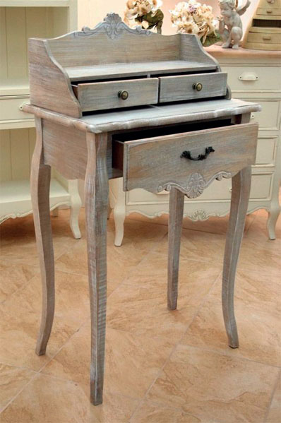 Предметы мебели могут быть как старинные, так и новые, но выкрашенные в светлые пастельные тона и местами затертые. Характерным для этого стиля будет наличие большого количества нежного текстиля, салфеток, подушек, покрывал в сочетании с чехлами на стульях и креслах.
