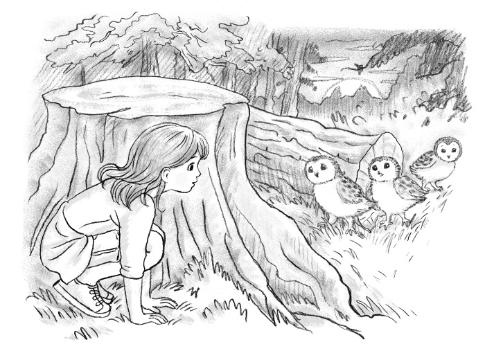 Флисс пригнулась, спрятавшись за большим пнём. Из своего укрытия она внимательно следила за птицей, щурясь от света угасающего солнца и стараясь ничего не пропустить. Какое-то время ничего не происходило – сипуха просто бродила по земле. Но вдруг из-за спиленного дерева на открытый пятачок вышли, покачиваясь, три совёнка. Наверное, гнездо упало на землю! Их ярко-белые пёрышки слегка взъерошились, но, похоже, все трое не пострадали. Возможно, ветви окружающих деревьев смягчили их падение. Отлично!
