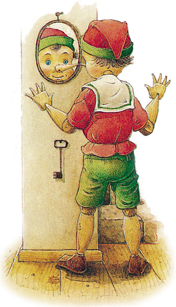 Пиноккио подбежал к чану с водой, чтобы посмотреть на своё отражение, и увиденное так понравилось ему, что он приосанился, как павлин, и воскликнул: