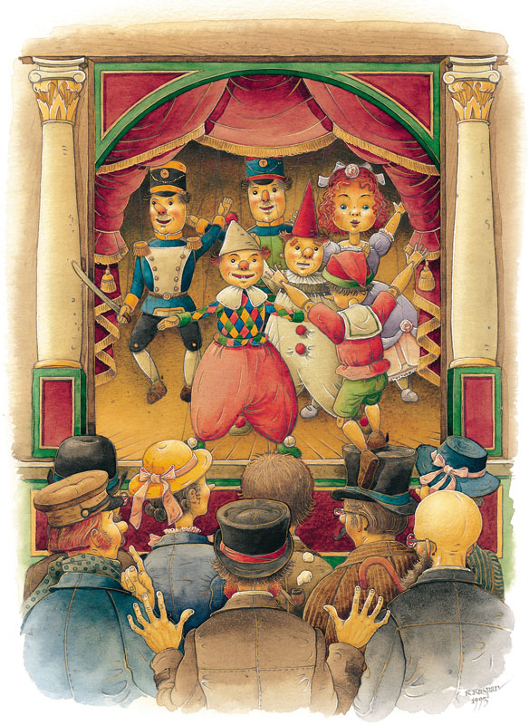С появлением Пиноккио в театре поднялся настоящий переполох. Надо сказать, что занавес уже был поднят и представление началось.