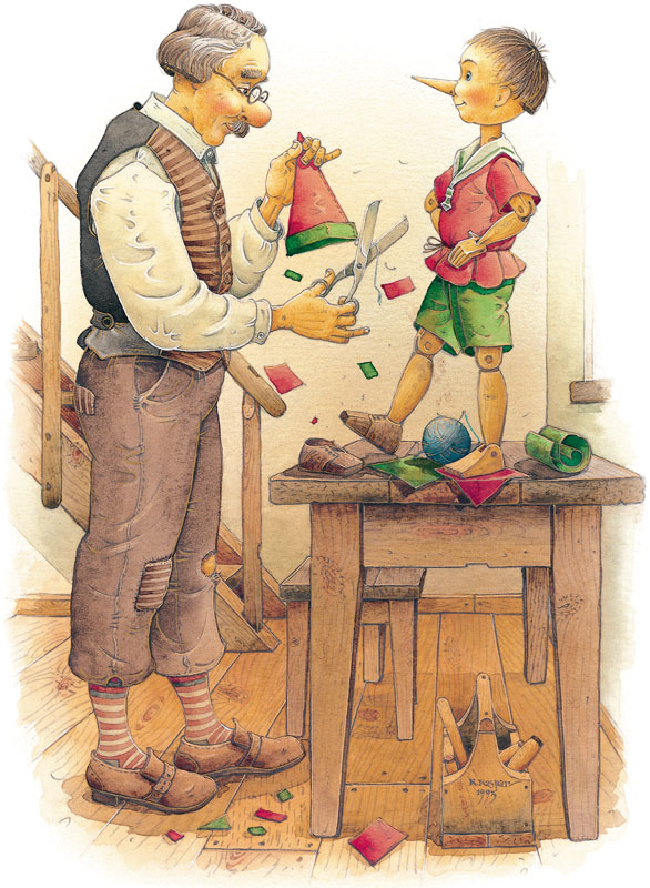Джепетто, у которого по бедности и гроша не было в кармане, сделал кукле костюм из цветной бумаги, пару башмаков из древесной коры и колпак из кусочка теста.