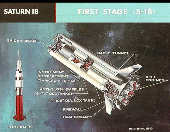 Информация о двигателях первой ступени ракеты «Сатурн-1Б»: «Маршевые двигатели: 8 × Н-1. Тяга -6.700 кН; Удельный импульс – 289 с.; Время работы – 150 с.; Горючее, керосин; Окислитель, жидкий кислород». [1] Нет никаких двигателей торможения, подобных тому, которые НАСА декларировало в конструкции ракеты «Сатурн-5», в этой ракете США. Это означает, что если после старта ракеты Сатурн-1Б» произойдет такая же серия ярких вспышек, как и при старте ракеты «Сатурн-5», то объяснить это явление работой ретро-двигателей будет нельзя. В схеме нет никаких упоминаний о двигателях торможения второй ступени. Значит, их отсутствие тоже должно исключать появление вспышек. Отсутствует причина для возникновения большого облака пламени и дыма при отделении первой ступени. Общая схема первой ступени показывает, что окислитель и горючее заливалось в боковые баки, видимо, бак с окислителем соседствовал с баками, где было горючее. Следующая схема показывает другую компоновку указанных баков.