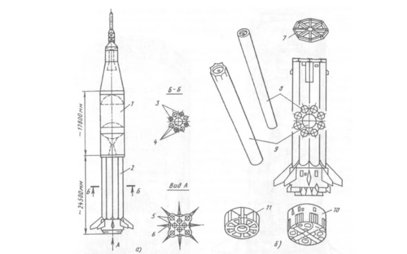 Мифология НАСА: «А) Ракета «Сатурн-1Б» 1. РБ S-IV; 2. РБ S-IV; 3. Баки горючего; 4. Баки с окислителем (жидкий кислород); 5. Схема расположения двигателей первой ступени; 6. Стабилизатор. Б) 7. Верхняя силовая рама; 8. Боковые баки окислителя (2 штуки) и баки горючего (4 штуки): 9. Центральный бак окислителя; 10. Хвостовой отсек; 11. Нижняя силовая рама крепления двигателей, стабилизаторов и опорных пят. [4] Если верить этой схеме, то жидкий кислород заливался, якобы, по версии варианта «а», в центральный бак и в четыре бака по бокам. По версии варианта «б» в два бака заливался окислитель, в 4 боковых бака заливалось горючее. Официальная версия НАСА: «Вторая ступень «Сатурн-IB». Габаритно-массовые характеристики: Длина 17,8 м.; Диаметр 6,6 м.; Масса 119 900 кг. Характеристики ДУ: Маршевый «J-2». Тип ДУ: ЖРД. Горючее: жидкий водород. Окислитель: жидкий кислород». [3] Баки с жидким водородом и жидким кислородом во второй ступени ракеты «Сатурн-1Б» крепились изнутри к поверхности покрытия ступеней. Это означает, что они тоже должны были охладить боковые стороны ступеней. Документация НАСА наглядно демонстрирует ситуацию.