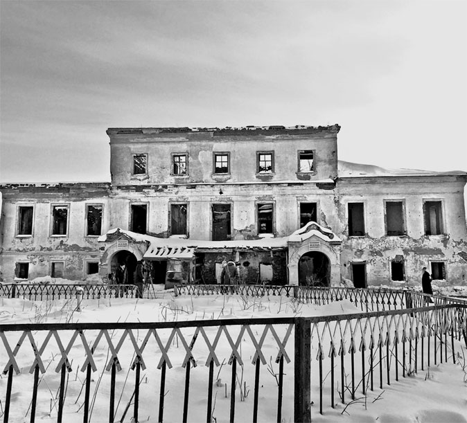 Построено здание было после Отечественной войны 1812 г. (так ее называют в России, а для английского соавтора мы сделали пояснение: было сделано «после Наполеоновских войн»). К сожалению, в 1990-е годы здесь приключился пожар (студентки сельхозтехникума не выключили утюг), и от былого величия остались только стены и обгорелые перекрытия.