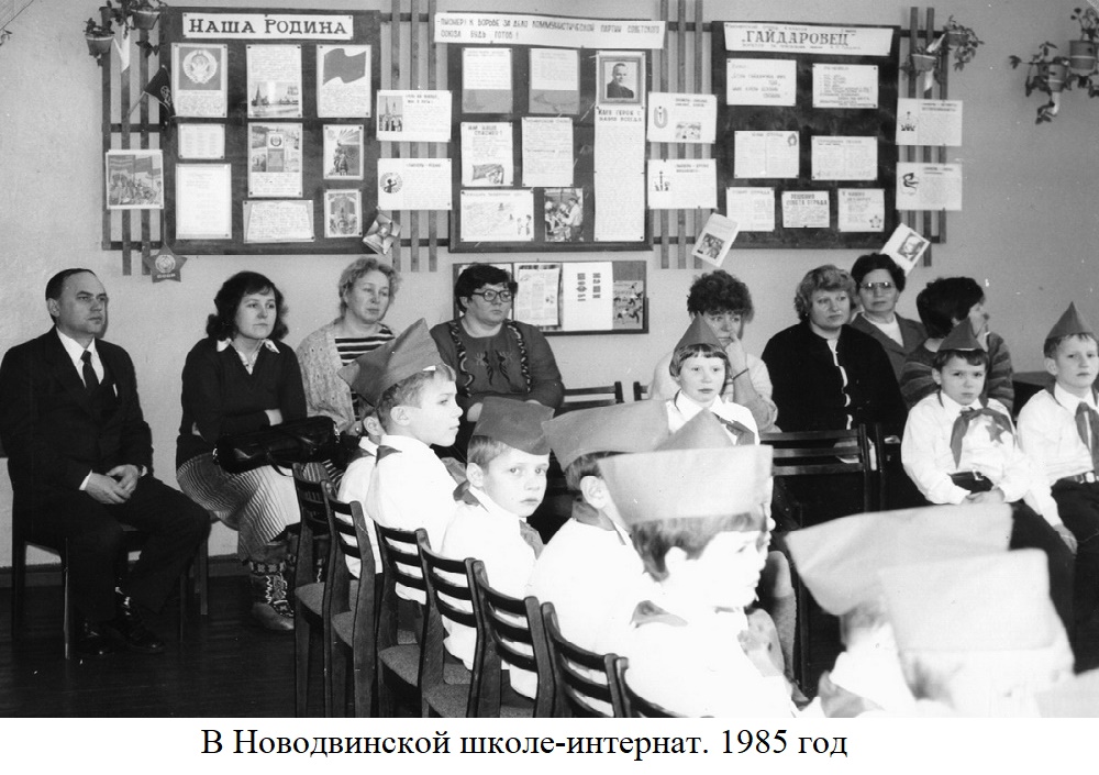 Сентябрь 1984 года. Встреча коллектива работников школы-интерната с информационной группой, в которую входили председатель Новодвинского горисполкома, заведующий промышленно – транспортным отделом горкома партии, секретарь горкома комсомола и другие.