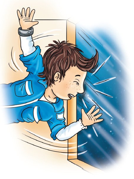 Мальчик силился дотянуться до одного из поручней, но двигался слишком быстро. И, хотя Том попытался затормозить руками, он всё-таки с силой врезался носом в окно: