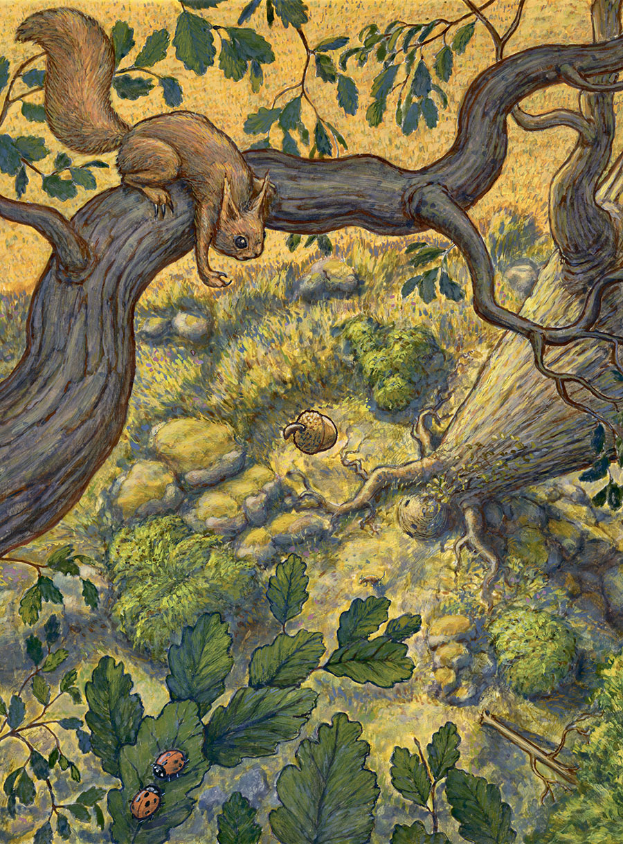 И вот однажды произошла досадная неприятность, которая перевернула всю мышиную жизнь. Мышонок, как всегда, собирал зёрна, упавшие на землю около его домика. День был ясный, летний ветерок шуршал листвой деревьев. Господин Белкин вылез из дупла погреться на солнышке. Сидя на ветке старого дуба, он грыз жёлудь и наблюдал, как внизу хлопочет Мышонок. И только Белкин собрался поздороваться, как жёлудь выскользнул из его лап и упал прямо на голову Мышонку. От неожиданного, непонятного удара Мышонок подскочил и стрелой помчался в домик.