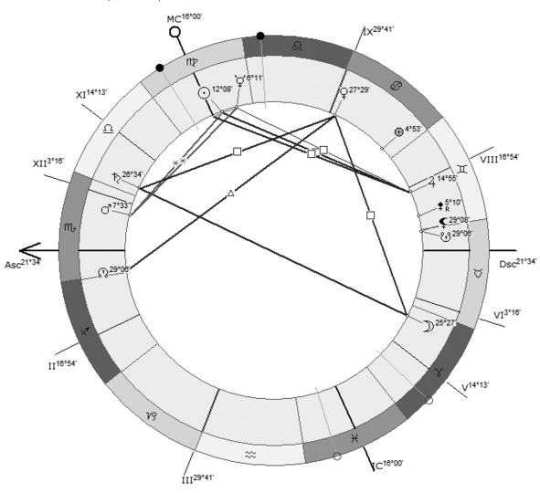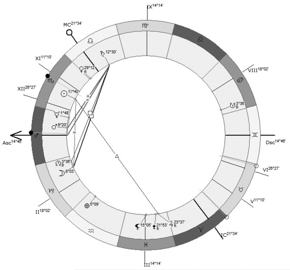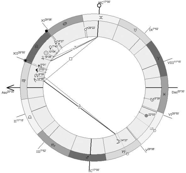Рис. 2b. Астрологическая Карта: куспиды V и XI домов в ней попадают в последние градусы знаков.