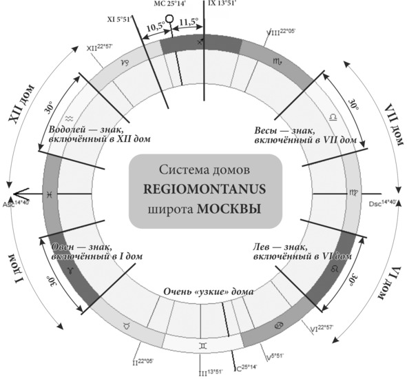 Но их идея домофикации хорошо работала на их широтах, вблизи тропика. А вот дальше на север с ней начинали определённые трудности. Главная из таких проблем – размер (протяжённость) астрологического дома. Уже на широте в 55°(широта Новосибирска или Москвы) нередко возникают ситуации, когда некоторые дома получаются чрезвычайно малыми, всего по нескольку градусов, зато при этом другие оказываются настолько протяжёнными, что могут включать в себя сразу по нескольку зодиакальных знаков (рис. 2а).