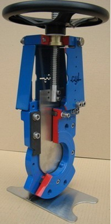 Ножевой запирающий элемент помещается в корпусе, но обычная конструкция сальникового уплотнения не может быть применена. Задвижки идеально подходят для использования на вязких, порошкообразных средах, пульпах, шламах, сточных водах и применяются в горной, пищевой, цементной, целлюлозно-бумажной промышленности. Ножевые задвижки изготавливаются с уплотнениями металл-по-металлу или мягкими седлами, которые полностью герметичны в обоих направлениях.