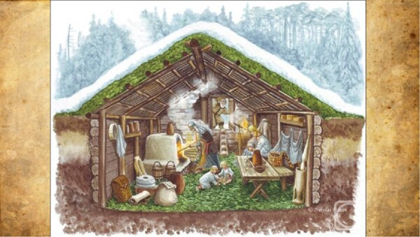 До XII—XIII вв. изба представляла собой бревенчатое строение, до трети уходящее в землю, а один, или три-четыре толстых венца сруба возвышались над землёй, образуя полуземлянку. Дверь заменяло небольшое входное отверстие, примерно 0,9 м на 1,0 м, прикрываемое парой связанных бревенчатых половинок и пологом. В глубине древней избы располагался сложенный из каменьев очаг. Дым сохранялся как можно дольше в помещении, и затем рассеивался через полог.