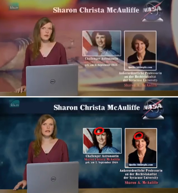 Ведущая так прокомментировала основные признаки сходства двух женщин: «В ходе расследования обмана со Спейс-шаттлом для Шерон МакОлифф тоже нашелся подходящий дублер с аналогичным внешним видом и, как бы это не удивительно, с тем же именем. Если взять во внимание прошедшие 30 лет, то выдающийся профессор факультета права Сиракьюского университета выглядит точно так же, как астронавт МакОлифф. У нее не только та же внешность, но и соответствующий возраст.