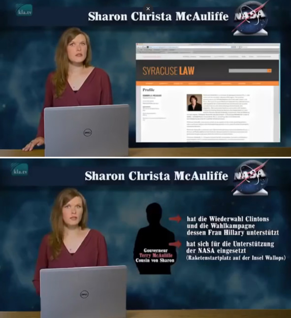Стоит обратить внимание и на детали, как, например, вихор от средины лба в левую сторону. Именно она работает преподавателем в заведении по обучению юристов. Именно она, адвокат Шэрон Криста МакОлифф, которая так же работает в школе права города Сиракьюс, штата Нью-Йорк, является также кузиной губернатора штата Виргиния Терри МакОлиффа. Тот, в свою очередь, поддерживал как переизбрание Клинтона, так и избрание его жены Хиллари председателем кампании. Кроме того, он содействовал поддержке НАСА по размещению космодрома на острове Уоллопс штата Виргиния в Атлантике». [5]