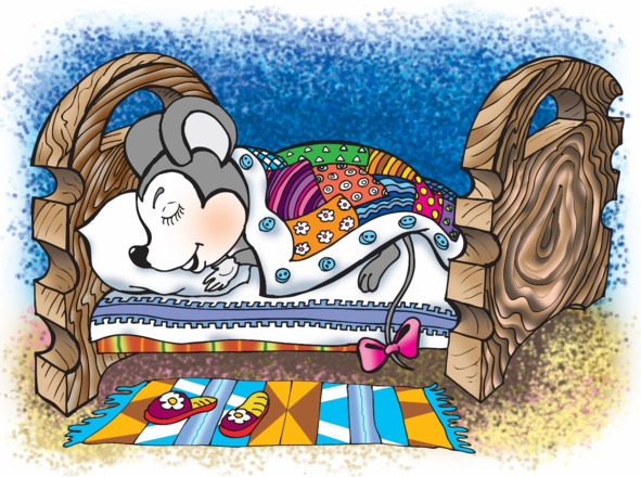 Не забыли они и про маленький домик, расположившийся среди корней старого дерева. Там, в небольшой комнате, где было очень тепло и тихо, стояла кроватка, вырезанная из ствола огромного дуба. Покрытая пёстрым одеялом, сшитым из разноцветных лоскутков, на первый взгляд она казалась пустой. Но любопытные лучики сразу разглядели чёрный нос-пуговку и тонкий серый хвостик с розовым атласным бантом, свисавший с края кроватки. Нос сопел во сне, а хвост с бантиком немного подрагивал. Один шаловливый луч не удержался и пощекотал нос совсем чуть-чуть, самую малость. Носик вздрогнул, поморщился и… чихнул.