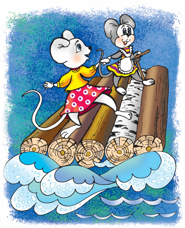 Солнце уже поднялось высоко, а мышки тем временем добрались до реки. Река хоть и небольшая, но и мышки ведь совсем малютки – как же им перебраться? Увидела Мышка-разбойница нору на берегу, а рядом плот из веток. В той норе жила большая старая Крыса. Не любила она гостей, а ещё больше не любила воду, вот и переплывала речку на плоту.