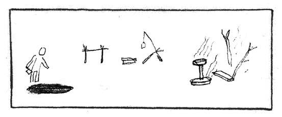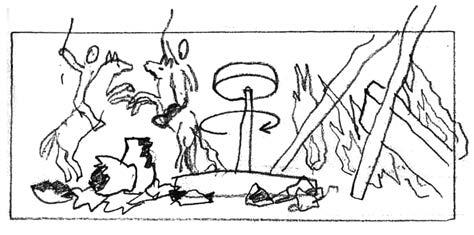 Там, де стояла ХАТА, вогонь ліниво облизує її рештки, наче ситий собака – кістку. Гончарний круг теж палає, уповільнюючи свої оберти. Останні оберти у вогняному вінці робить гончарний круг.