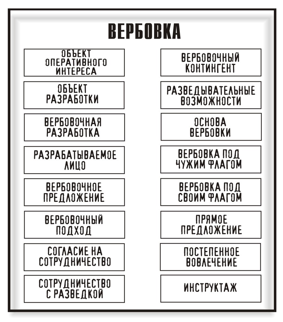 Вербовка – 1. Привлечение к конспиративному сотрудничеству с разведкой; осуществляется в форме прямого предложения или в форме постепенного вовлечения в сотрудничество; осуществляется после изучения кандидата на вербовку, определения возможной основы вербовки и разведывательных возможностей; на основании изучения особенностей кандидата на вербовку и определения возможностей разведки возможно использование своего или чужого флага. 2. Осознание субъектом возможности восстановить определенность своего существования с помощью взаимодействия с разведкой другого государства и его предложение разведке о сотрудничестве.
