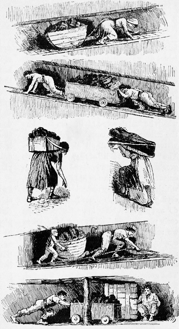 Не далее как в 1841 г. неграмотная семнадцатилетняя девушка Пейшенс Кершоу рассказывала на заседании парламентской комиссии об условиях, в которых она работала «таскальщицей», перемещая вагонетки с углем из забоя к стволу шахты: