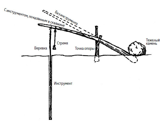 Труднее работалось со скальными породами. Камень требовалось бурить, для чего в земле сперва пробивали дыру в палец глубиной: это делали долотом, крепя его к концу последовательно соединенных стержней из кованого железа. Рычагом служил упругий шест: один его конец закапывали в землю и прижимали тяжелым камнем, середину шеста поддерживала рогатина – точка опоры, а свободный верхний конец позволял землекопу, вставив ноги в стремена, с силой давить – и железные стержни с долотом могли подниматься и опускаться.