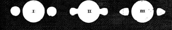 Ранние представления о Сатурне: 1) Галилей, 1610 г.; 2) Христофор Шейнер, 1614 г.; 3) Джованни Батиста Риччоли, 1641 г. Гюйгенс опубликовал эти и другие версии в своей книге, вышедшей в 1659 г., в которой справедливо предположил, что «уши» Сатурна – это кольца