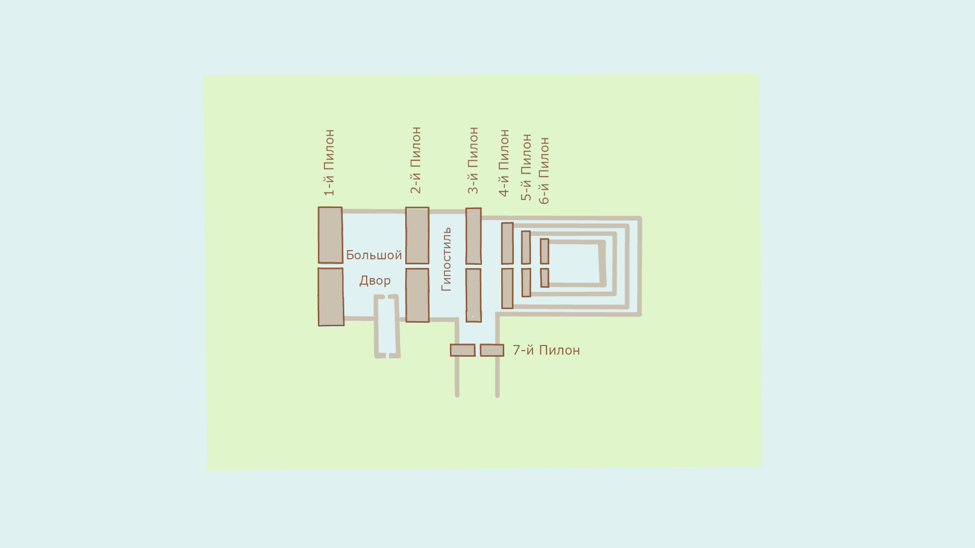 План храма показан на рисунке 7.3. Сложная конфигурация архитектурного ансамбля возникла вследствие многочисленных перестроек, продолжавшихся длительное время. По мнению большинства исследователей, самая старая часть сооружения находится за шестым пилоном. Впоследствии были построены пятая и четвёртая башни с соответствующими им стенами.