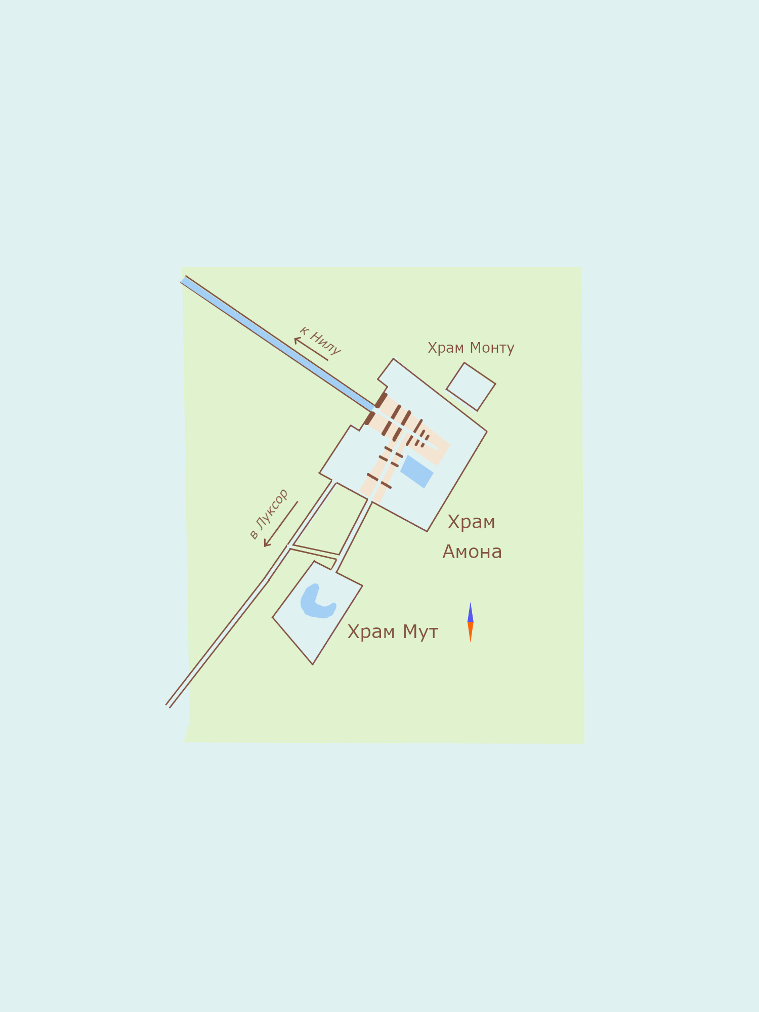 Храм Амона. На рисунке 7. 2 показаны три группы храмов, каждая из которых обнесена собственной оградой. Комплекс Амона защищён мощной крепостной стеной длиной почти два с половиной километра. Внутри огороженного пространства находились следующие объекты: