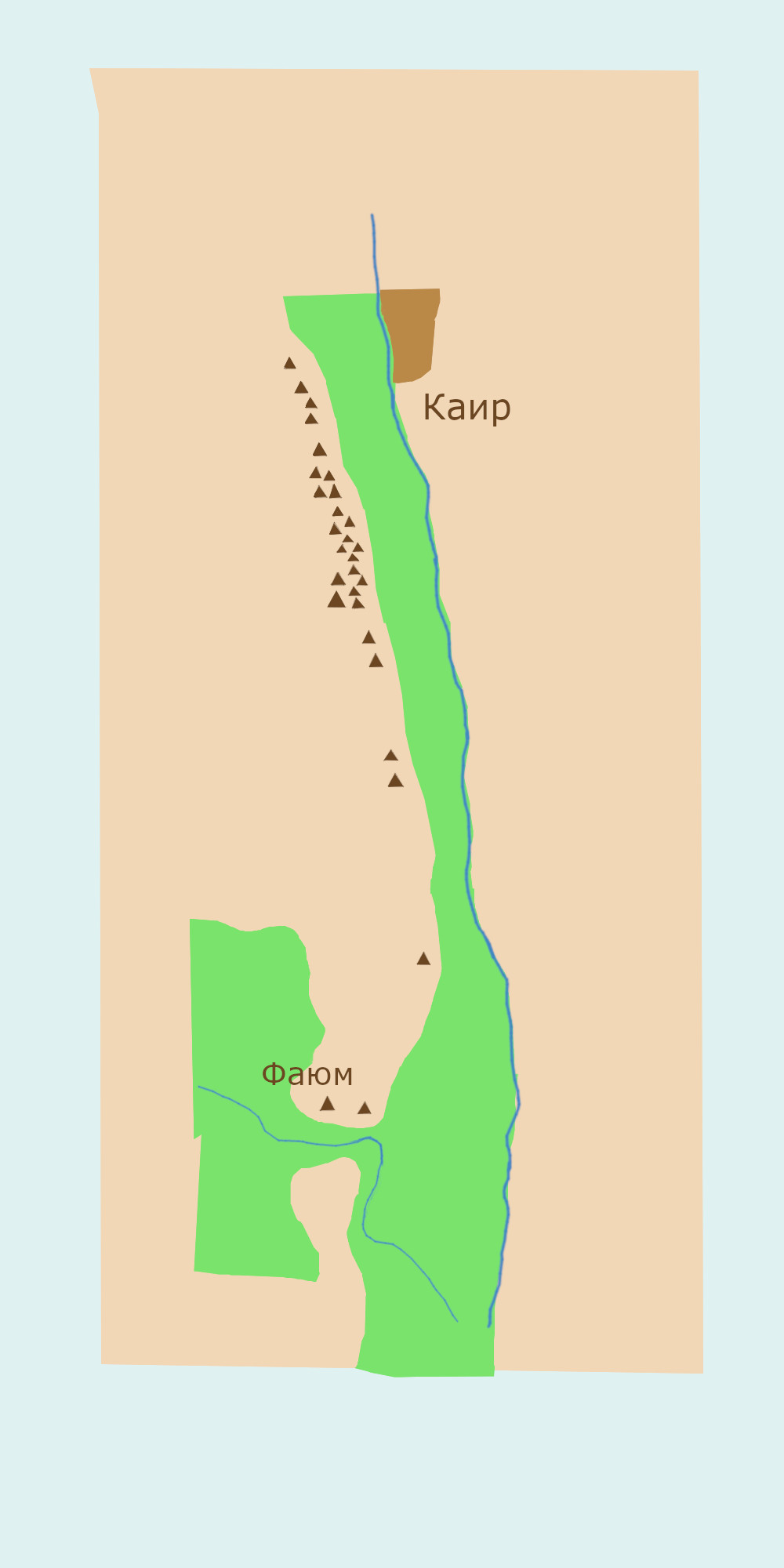 Поля пирамид. На рисунке 6.2 представлен план, поясняющий расположение пирамид на карте Египта. Сразу в глаза бросается тот факт, что сооружения расположены вблизи линии, являющейся границей между пустыней и зелёным оазисом. Памятники истории сконцентрированы отдельными группами, которые принято называть полями.