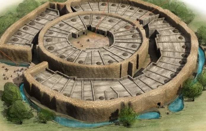 Например, оборонительные стены Аркаима также имели кольцеобразную форму. В центре крепости находилась площадь с очагом, которая, видимо, предназначалась, в том числе, и для культовых обрядов. Жилища площадью от 50 до 300 кв. м с кухнями, спальными комнатами, кладовками, вспомогательными помещениями, а также металлургические, гончарные, ткацкие и другие мастерские располагались кольцом, примыкая к внутренней стороне оборонительной стены. Выходы из жилищ, мастерских и других помещений были обращены к центру площади. По крышам жилищ могли перемещаться оборонявщиеся. В крепости имелась система водоснабжения и ливневой канализации. Крепость имела две, концентрично расположенные, кольцеобразные оборонительные стены. Вокруг внешней оборонительной стены находился ров с водой, через который в крепость вел деревянный мост. Крепостные стены так же, как и у западных славян, имели бревенчатые каркасы, заполненные глиной, камнями, грунтом. Население, которое жило снаружи крепости, в случае угрозы могло укрываться внутри крепости.