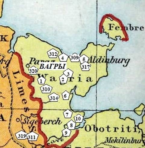 Условные границы земель славян-вагров и их основные городища-крепости, нанесенные на карту 10 века [5]: 1- Плуне (Plön), 2 – Утин (Eutin), 3 – Укляй (Uklei), 4 – Лютица (Лютенбург/ Lütjenburg), 5 – Старигард (Oldenburg), 6 – Зюсел (Süsel), 7 – в районе Pansdorf, 8 – Любице (Alt Lubeck), 9 – Буку (Bucu), 10 – в районе Pöppendorf, 309 – Зелен (Sehlendorf), 310 – Божово (Босау), 311 – Bad Oldesloe, 312 – Фрезен, 314- Hassendorf, 317 – Moosbruch, 319 – Nütschau, 320 –Scharstorf