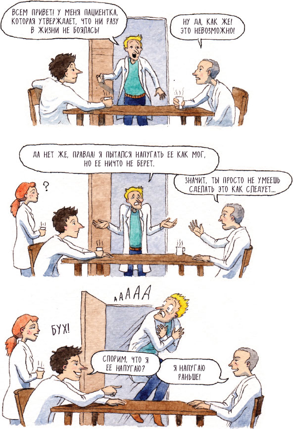 Сегодня Сюзанна уже пожилая женщина, и ученые все еще напрасно пытаются напугать ее. Такая суперспособность может показаться очень заманчивой, но все не так просто: дело в том, что страх полезен – он защищает нас. Именно благодаря страху мы распознаем опасность. Например, когда боимся ос, мы к ним не подходим, избегая укусов. Поскольку Сюзанна не испытывала страха, она наверняка ошибалась гораздо чаще, чем большинство из нас. Поэтому завидовать здесь нечему – в страхе наше спасение.