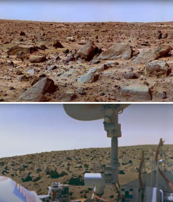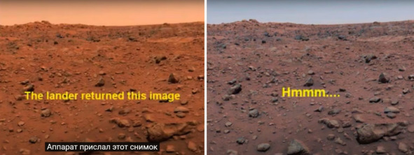 Джерри очень наглядно продемонстрировал, как можно с помощью регулировки «цветовой температуры» превратить снимок с непонятными цветами неба в фотографию, на которой изображено обычное земное небо. Викинг 1 прислал фотографию с ярко оранжевым небом «Марса».