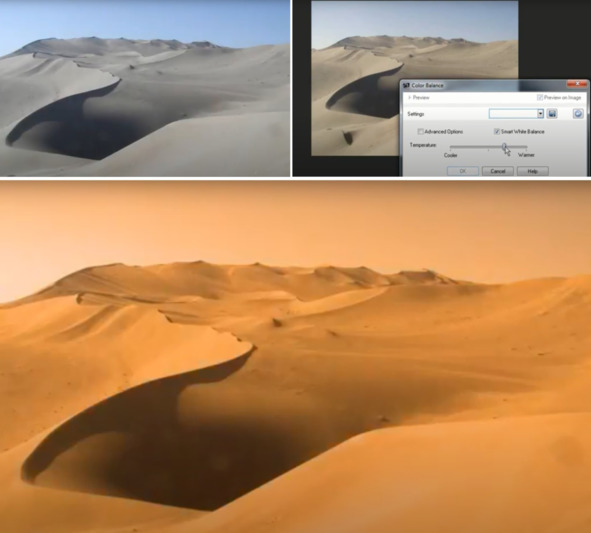 Но простая манипуляция с цветовой температурой на компьютере показывает исходный снимок, где небо голубое. Изменение параметра цветовой температуры и перед зрителями предстают земные пейзажи. Для справки: «Цветовая температура (ЦТ) – это характеристика интенсивности излучения источника света. Цифровые фотоаппараты и видеокамеры автоматически определяют цветовую температуру сюжета: портрет, ночной пейзаж и другие. Настройка цветовой температуры заложена в опции «баланс белого». [5] В компьютере – «Баланс цвета».