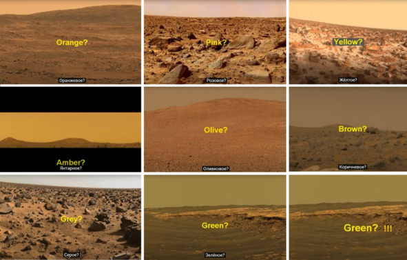 Американские обманщики показали много вариантов цветного «марсианского неба»: Оранжевое, розовой, Желтое, Янтарное, Оливковое, Коричневой, Серое и наконец, Зеленое!