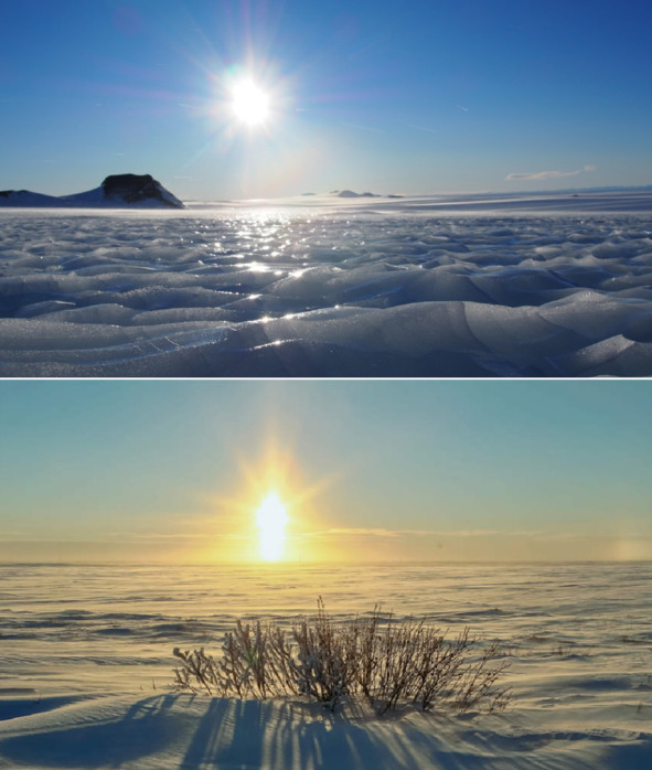 Лживые американские пропагандисты не смотрели фотографии солнца в широтах близких к полюсу. Солнце находится близко к горизонту. Оно светит среди синего или голубого неба. Ниже представлены фотографии из районов, близких к Южному и Северному полюсам. Подпись к верхней фотографии из Антарктиды: «Большинство льда покрыто снегом, и метеоритов под ним не видно. Но в некоторых местах около гор есть участки многолетнего голубого льда, где нет снега. Благодаря современным технологиям и съемкам из космоса в российской сфере влияния в Антарктиде были найдены такие места». [4] Фотография выполнена без фильтра. Если бы он был, то изображение Солнца выглядело бы как кружок с четкими границами.