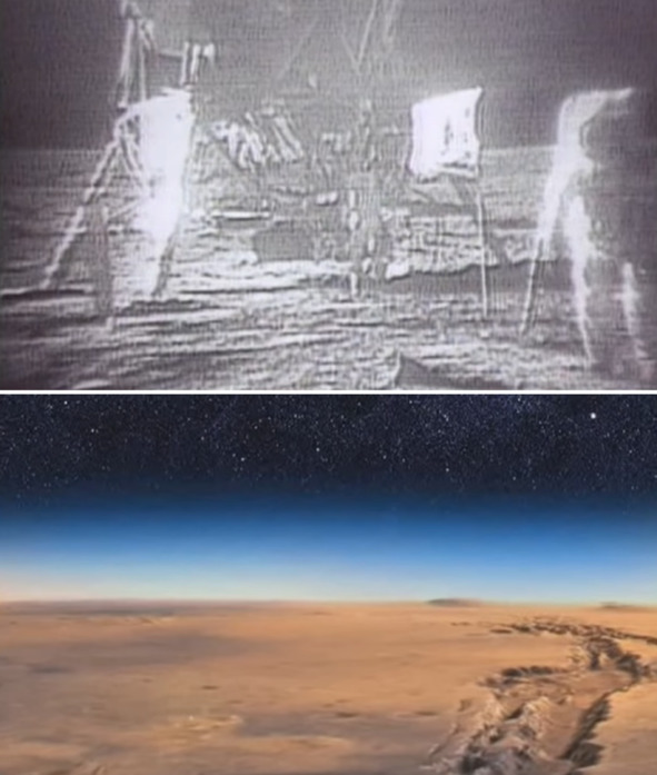 Американские пропагандисты в фильмах, где откровенно пропагандируются фальшивые американские достижения, зрителям разъяснили следующее: «Астронавты, побывавшие на Луне, видели, что небо там всегда черное. Это потому что на Луне нет атмосферы». [6] При этом диктор не упоминает, что атмосфера Марса не на много лучше «атмосферы» Луны. Комментатор выдал необычную версию о том, что на Марсе небо не оранжевое, а голубое, но у самого горизонта: «А на Марсе, где есть хоть какая-то атмосфера, небо тоже голубоватое, правда только у самого горизонта». [6] Это просто невероятное утверждение рушит мифологию НАСА об оранжевом, красноватом цвете «марсианского неба». Но и сказка о том, что марсианское небо голубое по краям не подтвердилась.