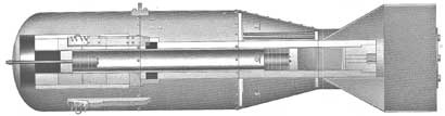 На рисунке бомбы «Малыш» красные части заряда – это «мишень» и «снаряд» внутреннего ствола гладкоствольной пушки с длиной ствола 1,8 м, калибром 164 мм. Заряд кордитного пороха 3.5 кг разгонял подвижную часть ядерного заряда в 38,5 кг в виде трубы из колец оружейного урана-235 до скорости 300 м/с. Неподвижная часть заряда в виде мишени-цилиндра из колец с меньшим диаметром, входившими во внутреннюю часть подвижного заряда, имела 25,6 кг урана-235. Общая масса заряда 64,1 кг превышала критическую. Вокруг неподвижной части располагался отражатель нейтронов и «держатель заряда» (тампер – замедлитель) с зазором 59 мм. Инициатор нейтронов выполнили из Бериллия и Полония-210. Полураспад Полония-210 всего 138 суток, поэтому при длительном хранении атомных бомб его надо или заменять, или хранить отдельно и вставлять только перед использованием бомбы. Это – «быстропортящийся» и весьма дорогой элемент, который нуждался в периодическом обновлении. Позже для источников нейтронов бомб стали применять другие вещества, например, на основе дейтеридов и третидов урана (см.[40], с. 180).