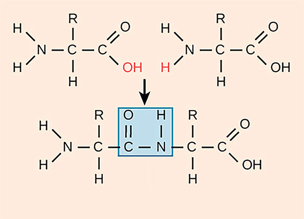 От одной аминокислоты с конца COOH (карбоксила) отщепляется – OH, а от конца с NH
