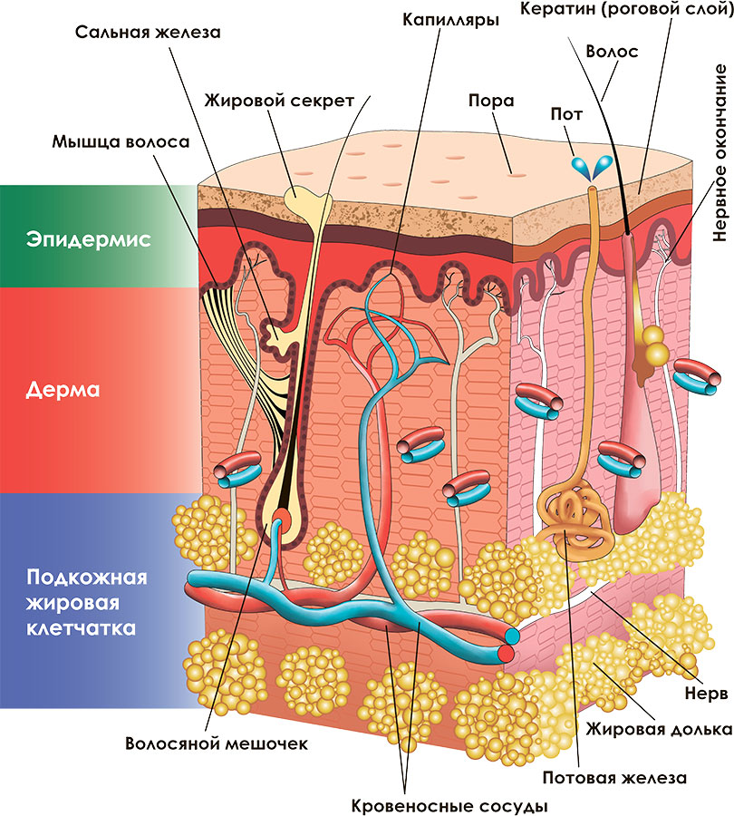 Следующий слой кожи – дерма, или дермис (толщина – около 2 мм) – представляет собой соединительную ткань из эластина, коллагена и гиалуроновой кислоты, которые вырабатываются клетками дермы фибробластами. Здесь расположено множество капилляров, волосяных корней (луковиц, фолликулов), потовых и сальных желез. Вокруг каждого фолликула имеется нерв, и из него растет всего один волосок. Сальные железы производят жир – кожное сало, чтобы обеспечивать коже водонепроницаемость, потовые железы охлаждают кожу для поддержания постоянной температуру тела.