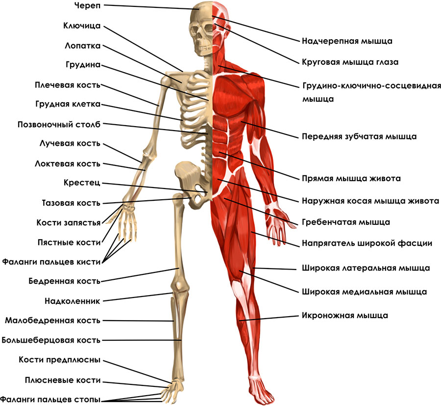 Нашей целью не является подробное описание анатомии человека. Коснемся только важнейших частей скелета (рис. 1.3.4). Прежде всего, это череп, надежно защищающий главный орган человека – мозг. На черепе крепятся лицевые мышцы, составляющие, кстати, 25 % всех мышц. Это обеспечивает замечательную мимику человеческого лица. Между прочим, челюстная мышца – самая сильная мышца человека.