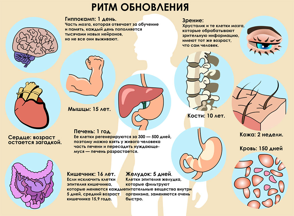 Как и внешний вид клеток, их функции и сама жизнь очень различны. Например, клетки мозга (нейроны) и клетки сердца (кардиомиоциты) живут с человеком всю его жизнь и почти не обновляются[5]. Клетки печени обновляются примерно каждые 150 дней, то есть печень «рождается» заново один раз в пять месяцев. Она способна восстановиться полностью, даже если в результате операции человек потерял до двух третей органа. А вот клетки кожи, желудка, внешние клетки легких, языка и т. д., находящиеся в местах соприкосновения с внешней средой, живут всего несколько дней.