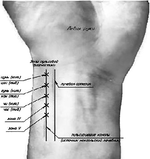 На рисунке 1 даны сведения о зонах на левой руке. На правой руке расположение зон аналогичное. На них преимущественно и проводится обследование. Выполняется преимущественно указательным, средним, безымянным пальцами левой и правой руки пульсодиагноста. Другие зоны используются для перепроверки сведений и т. п. подобных ситуаций. Например: наложен гипс на руку и т. п.