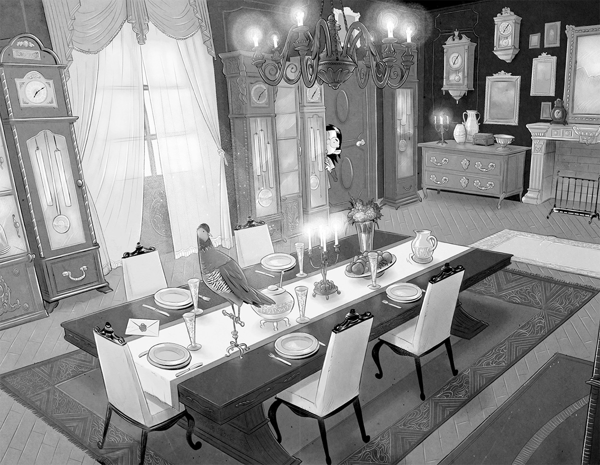 Ровно в восемь вечера на втором этаже тринадцать настенных часов принялись разом звонить на все голоса – именно они дали название самой загадочной комнате в доме семьи Интригио. На какофонические трели жалобно отозвался Орвиль, старая гончая собака семьи Интригио. Ласло появился в безупречном смокинге, возможно, лишь чуточку тесном на талии – как напоминание о том, насколько давно его владелец не был в деле. И в особенности о том, как он тем временем налегал на копчёности и сыры.