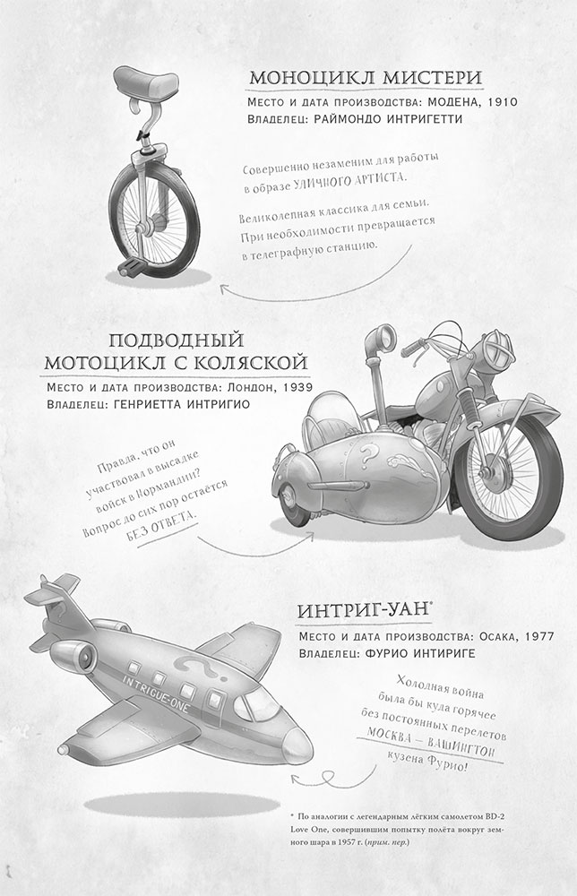Бина двинулась по ещё сонным бульварам голландской столицы, держа путь в сторону Дельфта. Через полчаса она свернула на пустынную пыльную дорожку, идущую вдоль канала, и подъехала к старому амбару, над которым лениво ворочала лопастями деревянная ветряная мельница. Все, кроме Бины, вышли из машины. Маркус и Зельдой побежали вперёд. Мальчик, покрутив замок, мигом открыл его своим талантом без помощи ключа и откатил тяжёлую раздвижную дверь. Внутри в молчаливом полумраке покоилась прославленная коллекция транспортных средств, принадлежавших семье Интригио. Чего тут только не было: красный родстер, на котором в шестидесятых дядя Пол ускользал от преследовавших его агентов КГБ, подводный мотоцикл с коляской от двоюродной тёти Генриетты, мини-джет кузена Фурио и даже чёрный лакированный катафалк огромных размеров.