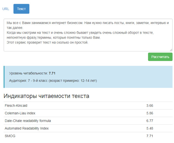 Так же сервис скажет для какого возраста и аудитории написан текст.