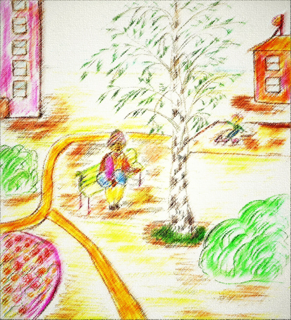 Через некоторое время бабушка, Айя и Дай зашли в подъезд дома, сели в лифт и благополучно поднялись на тридцать третий этаж, в свою квартиру. А вечером перед сном к детям пришла мама, которая рассказала новую сказку, поцеловала их и сказала, что она очень любит своих самых прекрасных детей на свете. Потом в спальню к детям пришла бабушка, потому что Дай никак не хотел ложиться спать. Мальчик встал на кровати на голову и сказал, что будет спать только так. Постояв в таком положении несколько минут, он вместе с подушкой свалился на пол, после чего Дай заполз в шкаф, откуда заявил, что спать будет на полке с одеждой. Бабушка терпеливо наблюдала за внуком, и когда тот наконец-то выбрался из своего укрытия и лёг на кровать, запела колыбельную песенку. Дети закрыли глаза, и вдруг им показалось, что они снова находятся во дворе своего дома и видят волшебницу, сидящую на лавочке. Потом, наигравшись на улице, Айя и Дай вместе со своей бабушкой отправились домой. Бабушка первой зашла в лифт, и в это время его двери вдруг перед детьми закрылись, а сам лифт сломался. Сестричка и братик испугались и стали звать на помощь. Но в подъезде никого не было. Тогда бабушка через дверь крикнула: