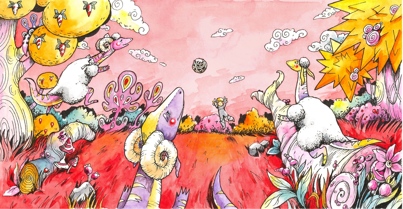 День выдался замечательный – солнце ярко светило сквозь облака на оранжевом небе. Лёгкий ветерок лениво раскачивал верхушки деревьев, срывая листья и устилая ими бордовую траву. По узкой тропинке, стуча копытами и сбивая росу мощными хвостами, неслись сквозь лес баранозаврята. Впереди бежали наперегонки старшие брат и сестра со звучными именами Бебеслав и Бебелла, за ними еле поспевал малыш Беня, сжимая в передних лапах плетёный мяч. На самом деле, его полное имя Бениамин, но все зовут его просто Беня, ведь у него ещё даже не выросли рожки.