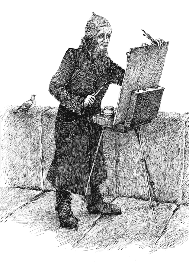 Компания агрессивных подростков окружила старика в коричневом пальто, притиснув его к каменному бортику набережной. Бритый, который был наглее прочих, схватил банку с грязной, бурой водой, в которой плавали куски краски, и выплеснул её на лицо, на седую, редкую бороду и одежду художника.