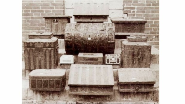 Экспонаты Музея Древностей. Коллекция сундуков (А. Н. Поповцев, 1910 год, фото из коллекции УГИАХМЗ, инв. № Ф-7).